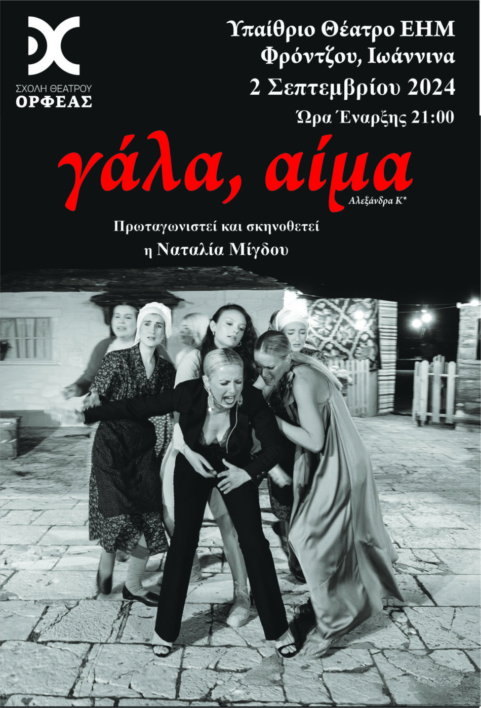 «ΓΑΛΑ ΑΙΜΑ» της Αλεξάνδρας Κ* στις 2 Σεπτεμβρίου στο Θέατρο της Ε.Η.Μ. στις 21.00