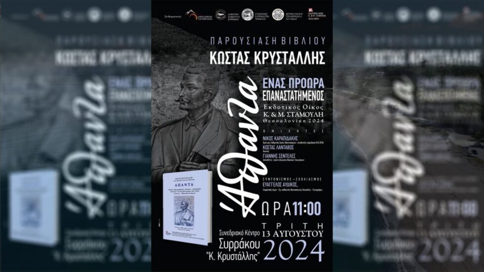 Τον νέο τόμο Απάντων του ποιητή Κώστα Κρυστάλλη παρουσιάζουν για πρώτη φορά στο Συρράκο, ο Δήμος Βορείων Τζουμέρκων με τη Δημοτική Κοινότητα Συρράκου, με συνδιοργανωτές τον Σύνδεσμο Συρρακιωτών Πρέβεζας, το Θερινό Σχολείο Τζουμέρκων και ΝΑ Πίνδου και τον Εκδοτικό Οίκο Κ. & Μ. Σταμούλη. Η παρουσίαση θα λάβει χώρα την Τρίτη 13 Αυγούστου, στις 11 το πρωί, στο συνεδριακό Κέντρο «Ο Κώστας Κρυστάλλης».