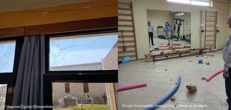 Αυτή τη φορά ομάδα ατόμων, κατά τις νυχτερινές ώρες, προξένησε ζημιές σε κτηριακές υποδομές εκπαίδευσης, σπάζοντας με πέτρες τα τζάμια στο 1ο Δημοτικό Σχολείο Ηγουμενίτσας και τα όργανα γυμναστικής στο εσωτερικό του Κέντρου Δημιουργικής Απασχόλησης Παιδιών με Αναπηρία «το εργαστήρι».