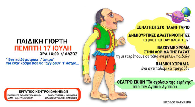 Παιδική γιορτή με τίτλο «Ένα παιδί μετράει τ’ άστρα» θα πραγματοποιηθεί την Πέμπτη 17 Ιουλίου στις 18:00 στο Άλσος Ιωαννίνων. Πρόκειται για μια εκδήλωση αφιερωμένη στα παιδιά, με στόχο να μεταφέρει ένα μήνυμα ειρήνης και δημιουργικής αναζήτησης, μέσα από δραστηριότητες που συνδυάζουν τη γνώση με τη φαντασία.