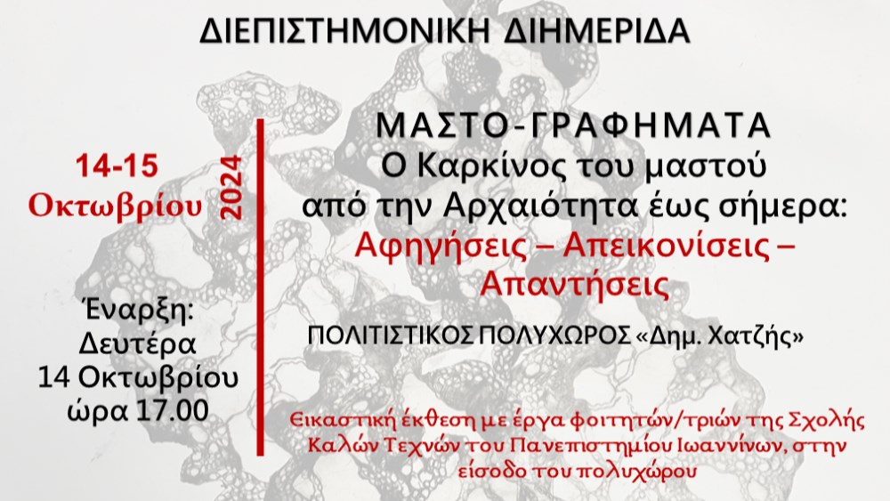 Ο Τομέας Κλασικής Φιλολογίας του Τμήματος Φιλολογίας του Πανεπιστημίου Ιωαννίνων σας προσκαλεί στη διεπιστημονική διημερίδα ΜΑΣΤΟ-ΓΡΑΦΗΜΑΤΑ. Ο καρκίνος του μαστού από την Αρχαιότητα έως σήμερα: Αφηγήσεις-Απεικονίσεις-Απαντήσεις. Σε μια προσπάθεια ολόπλευρης προσέγγισης της νόσου, ένωσαν τις δυνάμεις τους άνθρωποι από διαφορετικούς επιστημονικούς-επαγγελματικούς χώρους: φιλόλογοι, γλωσσολόγοι, ιστορικοί τέχνης, ψυχολόγοι,λογοτέχνες, καλλιτέχνες, γυμναστές, νομικοί και βέβαια γιατροί. Οι θεματικές περιοχές που απασχολούν τη διημερίδα διακρίνονται σε (1) Αφηγήσεις: Ο καρκίνος του μαστού στην ιατρική γραμματεία της αρχαιότητας, στη λογοτεχνία και στον κινηματογράφο, γλωσσικές αναπαραστάσεις / ανασημασιολογήσεις της νόσου (2) Απεικονίσεις: Από τις απεικονιστικές εξετάσεις του μαστού στις καλλιτεχνικές απεικονίσεις (3) Απαντήσεις: Πρόληψη, διάγνωση και θεραπεία (από την οπτική του ογκολόγου, από την οπτική του χειρουργού, νεώτερα δεδομένα στην ογκολογία και χειρουργική), ψυχολογικές και κοινωνικές πτυχές του καρκίνου, κοινωνιολογικές – νομικές προσεγγίσεις, ο ρόλος του φυσικοθεραπευτή – γυμναστή σε όλα τα στάδια της ογκολογικής διαχείρισης.