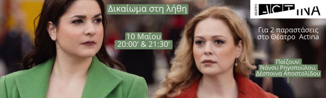Ερμηνεύουν οι Νάνσυ Ρηγοπούλου, Δέσποινα Αποστολίδου. Κρατήσεις στο τηλέφωνο: 6974865401 και προπώληση εισιτήριων ηλεκτρονικά στο https://www.more.com/gr-el/tickets/theater/dikaioma-sti-lithi-1