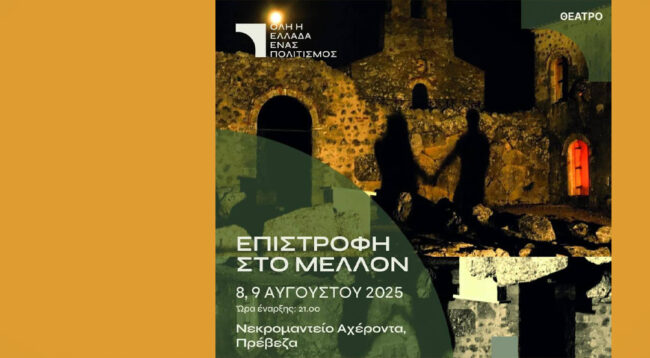 Μια μοναδική θεατρική εμπειρία υπό το φως της πανσελήνου φιλοξενεί το Νεκρομαντείο του Αχέροντα στις 8 και 9 Αυγούστου, στο πλαίσιο του θεσμού «Όλη η Ελλάδα ένας Πολιτισμός 2025» του Υπουργείου Πολιτισμού. Το νέο έργο «Επιστροφή στο Μέλλον» των Κωνσταντίνου Ζωγράφου και Πάνου Ζυγούρου φέρνει στο προσκήνιο ένα δραματικό πάντρεμα του αρχαίου με το σύγχρονο, του παρελθόντος με το παρόν.
