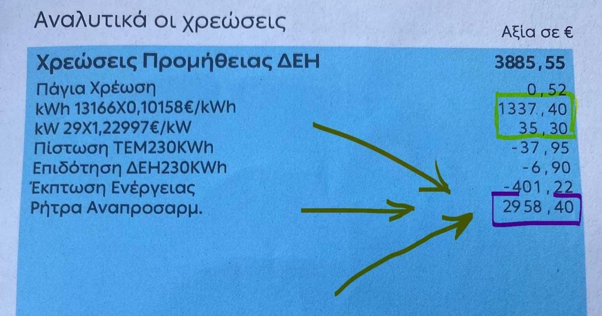 Από την ανάλυση του λογαριασμού φαίνεται ότι το κόστος του ρεύματος το μήνα είναι 1372,7 ευρώ με τη ρήτρα αναπροσαρμογής 2958,40 ευρώ και το τελικό ποσό που πρέπει να πληρώσει με την επιδότηση να φτάνει τα 3885,55 ευρώ.