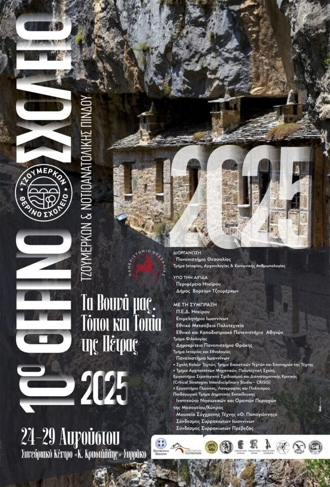 Το 10ο Θερινό Σχολείο Τζουμέρκων και Νοτιοανατολικής Πίνδου, με θέμα «Τα βουνά μας. Τόποι και τοπία της πέτρας», θα πραγματοποιηθεί στις 24-29 Αύγουστου στο Συρράκο, έναν τόπο γραφικό με πλούσια πολιτισμικά στοιχεία και ιδιαίτερη αρχιτεκτονική ταυτότητα. Η φετινή διοργάνωση περιλαμβάνει εκπαιδευτικές, ερευνητικές και πολιτιστικές δράσεις, με έμφαση στη διατήρηση και ανάδειξη των τοπικών χαρακτηριστικών και της παραδοσιακής αρχιτεκτονικής, ενώ παράλληλα ενισχύει την τοπική κοινωνία και προωθεί την αειφόρο ανάπτυξη.