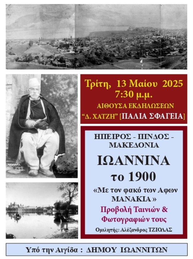 Μια ενδιαφέρουσα εκδήλωση με τίτλο “Ήπειρος, Πίνδος, Μακεδονία, Ιωάννινα το 1900-Μέσα από τον φακό των Αφών Μανάκια” θα πραγματοποιηθεί την Τρίτη 13 Μαίου (έναρξη 19:30), στον Πολυχώρο «Δ. Χατζής» Δήμου Ιωαννίνων, υπό την αιγίδα. Ομιλητής θα είναι ο Αλέξανδρος Τζιόλας, ενώ θα γίνουν προβολές ταινιών και φωτογραφιών των δυο πρωτοπόρων κινηματογραφιστών και φωτογράφων των Βαλκανίων.