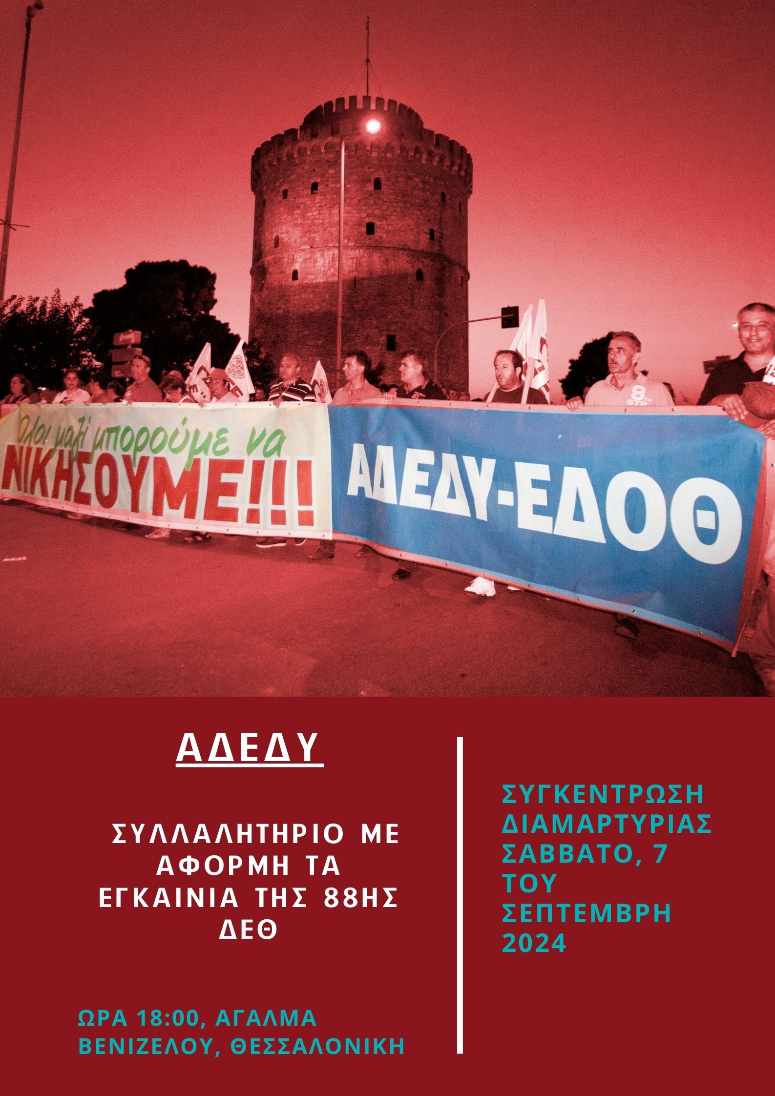 Το Νομαρχιακό Τμήμα Ιωαννίνων της Α.Δ.Ε.Δ.Υ., υλοποιώντας σχετική απόφαση της Εκτελεστικής Επιτροπής , αποφάσισε, με αφορμή τα εγκαίνια της ΔΕΘ, την συμμετοχή στο συλλαλητήριο μαζί με τους εργαζόμενους του Ιδιωτικού Τομέα το Σάββατο, 7 του Σεπτέμβρη του 2024, ώρα 18:00, στο άγαλμα Βενιζέλου στη Θεσσαλονίκη για την ανάδειξη των αιτημάτων μας και τη διεκδίκηση λύσεων σε αυτά.