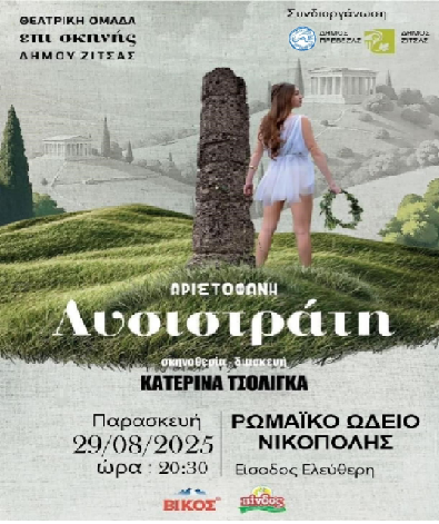 Η θεατρική ομάδα «ΕΠΙ ΣΚΗΝΗΣ» του Δήμου Ζίτσας θα παρουσιάσει αύριο Παρασκευή, 29 Αυγούστου, στις 20.30, στο Ρωμαϊκό Ωδείο της Νικόπολης (Πρέβεζα) με ελεύθερη είσοδο, την παράσταση με τη «Λυσιστράτη» του Αριστοφάνη, σε διασκευή και σκηνοθεσία της Κατερίνας Τσολίγκα.