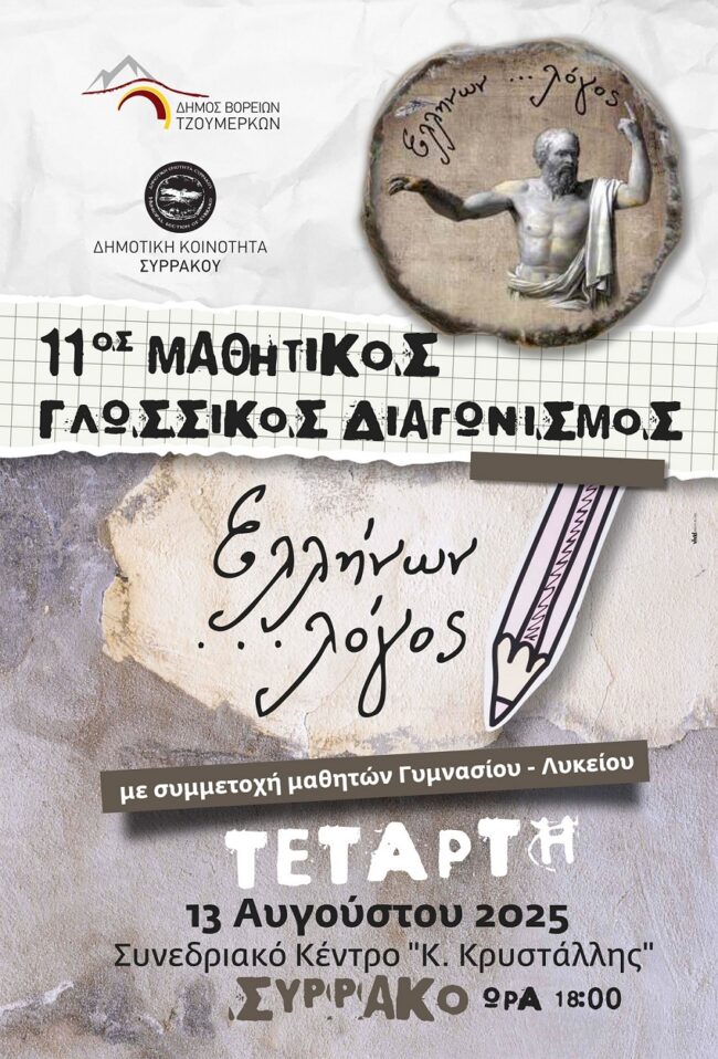Ο διαγωνισμός, που αποτελεί πρωτοβουλία του Δήμου Βορείων Τζουμέρκων και της Δημοτικής Κοινότητας Συρράκου, διοργανώνεται ανελλιπώς από το 2014, με στόχο την προώθηση της ελληνικής γλώσσας και της πολιτιστικής κληρονομιάς στους μαθητές Γυμνασίου και Λυκείου.