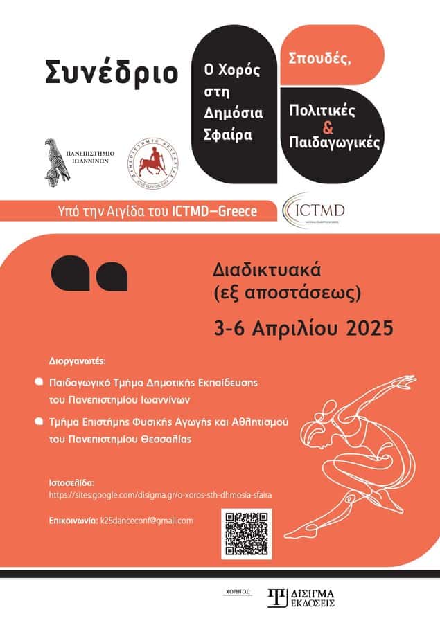 Με ευρεία συμμετοχή ολοκληρώθηκαν οι εργασίες του επιστημονικού συνεδρίου με τίτλο «Ο Χορός στη Δημόσια Σφαίρα. Σπουδές, Πολιτικές και Παιδαγωγικές», που διεξήχθη από τις 3 έως τις 6 Απριλίου, διαδικτυακά. Το Συνέδριο διοργανώθηκε από το Παιδαγωγικό Τμήμα Δημοτικής