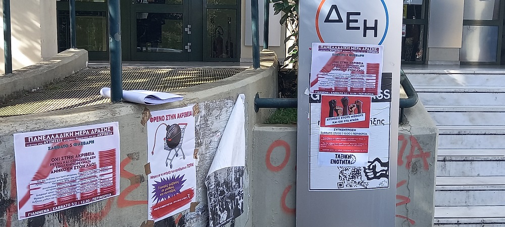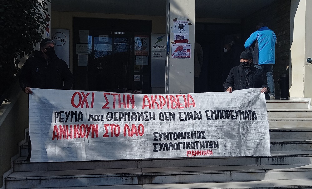Παράσταση διαμαρτυρίας μπροστά στην είσοδο της ΔΕΗ πραγματοποίησαν το μεσημέρι τη Πέμπτης (3/2) τα μέλη του Συντονισμού Συλλογικοτήτων ενάντια στις αυξήσεις των τιμών σε ενέργεια, ρεύμα και την ακρίβεια ενώ απηύθυναν κάλεσμα για την «Πανελλαδική μέρα δράσης ενάντια στις αυξήσεις ρεύματος-θέρμανσης & την ακρίβεια», το Σάββατο 5 Φλεβάρη με την συγκέντρωση και πορεία στα Ιωάννινα να γίνεται στη κεντρική πλατεία στις 12 μ.μ..