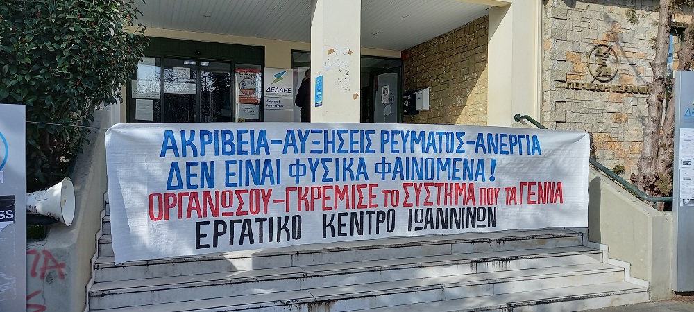 Παράσταση διαμαρτυρίας έξω από τη ΔΕΗ πραγματοποίησε το πρωί της Παρασκευής (4/2) το Εργατικό Κέντρο Ιωαννίνων ενάντια στις αυξήσεις του ρεύματος.