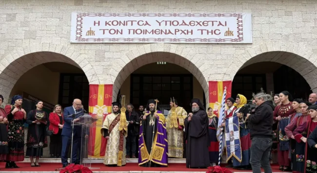 Τη συγκινητική υποδοχή ακολούθησε προσφώνηση από το Δήμαρχο Πωγωνίου ο οποίος τόνισε τη μεγάλη πνευματική και ιστορική σημασία της στιγμής. «Με βαθιά συγκίνηση και με πραγματική χαρά, σας καλωσορίζουμε σήμερα στο Δελβινάκι, στην καρδιά του Πωγωνίου και στην ιστορική έδρα της Μητροπόλεώς μας, έναν τόπο που κουβαλά αιώνες προσευχής, κόπου και παράδοσης». Ο κ. Καψάλης τόνισε παράλληλα διαχρονικό ρόλο της Εκκλησίας στα ακριτικά χωριά σημειώνοντας: «Εδώ, σε αυτά τα βουνά και τις κοιλάδες, η Εκκλησία δεν υπήρξε ποτέ κάτι μακρινό. Υπήρξε η παρουσία που στάθηκε δίπλα στον άνθρωπο. Κράτησε ενωμένους τους ανθρώπους όταν όλα γύρω ήταν αβέβαια. Έγινε στήριγμα για τους φτωχούς, παρηγοριά για τους πονεμένους, οδηγός για τους νέους».