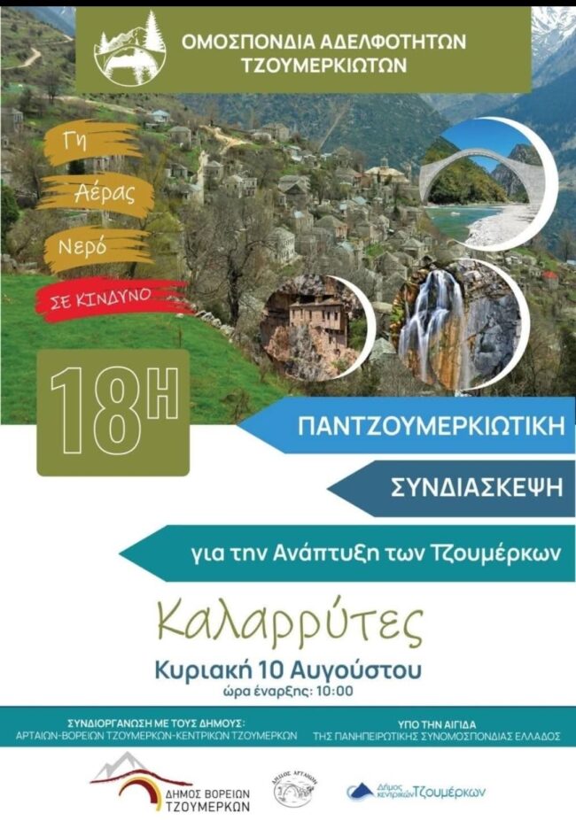 Τους Καλαρρύτες επέλεξε φέτος για τις εργασίες της 18ης Παντζουμερκιώτικης Συνδιάσκεψης η Ομοσπονδία Αδελφοτήτων Τζουμέρκων, που εκπροσωπεί στο λεκανοπέδιο της Αττικής 35 και πλέον σωματεία και αποδημητικές οργανώσεις των Τζουμέρκων.