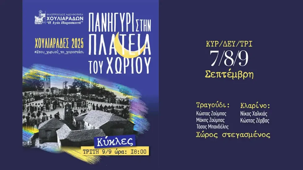 Η Φιλοπρόοδος Αδελφότητα Χουλιαράδων «Η Αγία Παρασκευή» προσκαλεί όλους στο καθιερωμένο τριήμερο παραδοσιακό πανηγύρι που θα πραγματοποιηθεί στην κεντρική πλατεία του χωριού στις 7, 8 και 9 Σεπτεμβρίου.