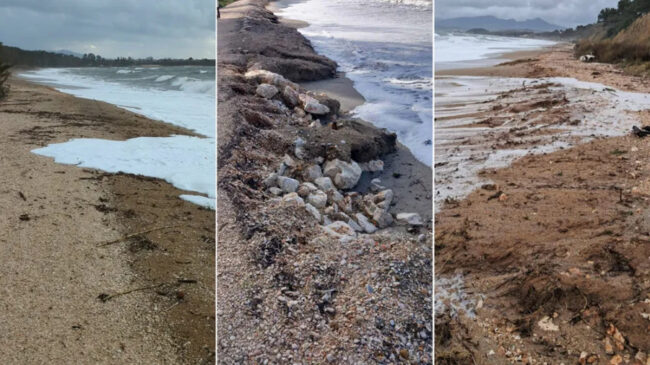”Συγκεκριμένα, όπως αναφέρει, σε μεγάλη έκταση της μοναδικού φυσικού κάλλους ακτής, όπως ήταν αναμενόμενο και είχαμε σχετικά προειδοποιήσει, οι ογκόλιθοι και τα αδρανή που χρησιμοποιήθηκαν για το μπάζωμα και τη δημιουργία σταθερής υπόβασης της νέας οδού (ποδηλατόδρομου) επί του αμμώδους εδάφους στη ζώνη αιγιαλού και παραλίας, έχουν αποκαλυφθεί και σημαντικό μέρος του υλικού έχει ολισθήσει και διασπαρεί στον αιγιαλό. Αποτέλεσμα αυτού είναι η εμφανής αισθητική αλλοίωση και πιθανά ολική μεταβολή/καταστροφή της αμμώδους παραλίας στο τμήμα παρέμβασης περί τα 2 χιλιόμετρα. Ενώ παράλληλα και για μεγάλο μήκος έχει καταργηθεί η ασφαλής πρόσβαση στην ακτή”.