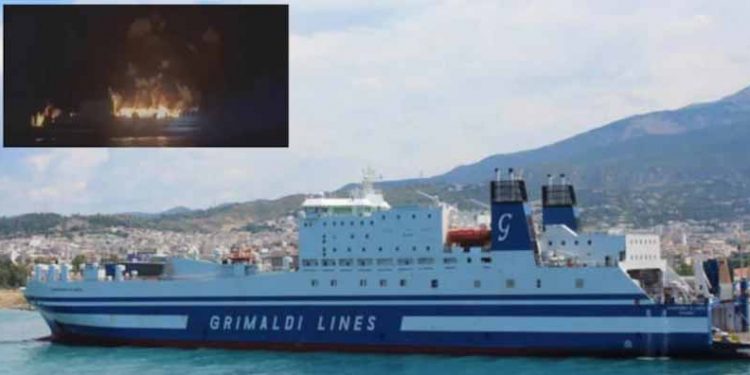 Η πυρκαγιά -από άγνωστη μέχρι στιγμής αιτία- εκδηλώθηκε στο κατάστρωμα 3 του επιβατηγού-οχηματαγωγού πλοίου, το οποίο καίγεται απ’ άκρη σ’ άκρη.