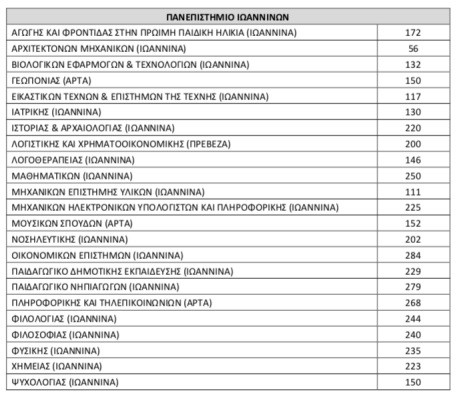 Για το πανεπιστήμιο Ιωαννίνων στις σχολές και τα τμήματα στα Γιάννενα, την Άρτα και την Πρέβεζα οι εισακτέοι είναι: