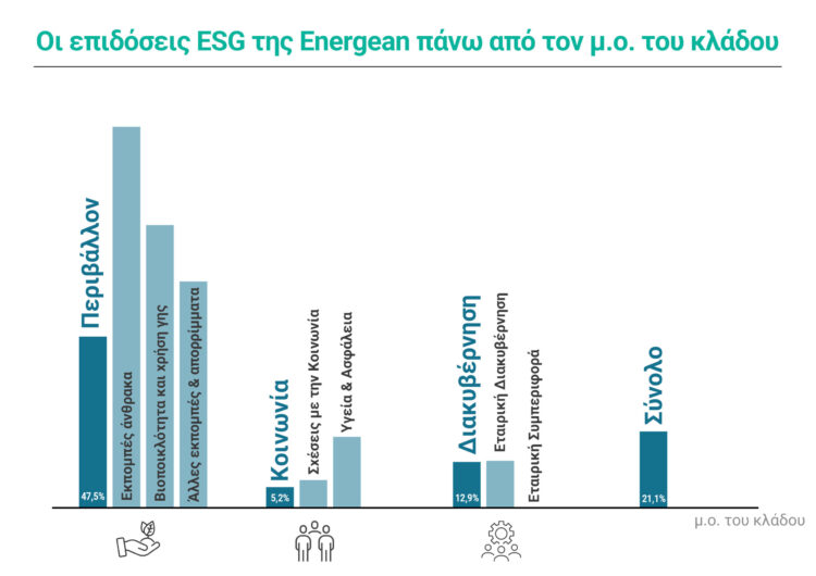 Είναι χαρακτηριστικό ότι η συνολική βαθμολογία που έλαβε η Energean είναι κατά 21,1% υψηλότερη του μέσου όρου του κλάδου ενώ, ως προς τα επιμέρους Κριτήρια είναι υψηλότερη κατά 47,5% στο Περιβάλλον, κατά 5,2% στην Κοινωνία και κατά 13% στην Εταιρική Διακυβέρνηση.  Ειδικά στις υποκατηγορίες του Περιβάλλοντος, οι επιδόσεις της Energean είναι ακόμη πιο εντυπωσιακές καθώς η εταιρεία συγκέντρωσε υψηλότερη βαθμολογία κατά 105,8% ως προς τις εκπομπές άνθρακα, κατά 79,3% ως προς την βιοποικιλότητα και την χρήση γης και κατά 63,3% ως προς άλλες εκπομπές και τα απορρίμματα, σε σχέση με τον μέσο όρο του κλάδου.