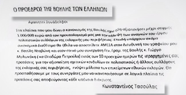 Μια πλαστή επιστολή με το όνομα του προέδρου της Βουλής των Ελλήνων, Κώστα Τασούλα ως αποστολέα προκάλεσε ένα μικρό πανικό ανάμεσα στους βουλευτές του Κοινοβουλίου. Ειδικότερα, στην επιστολή αυτή ο υπογράφων τους ζητούσε να του καταθέσουν τις προτάσεις τους για την επιχορήγηση πολιτιστικών συλλόγων.