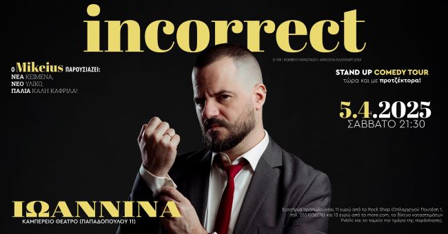 Νέα κωμική παράσταση, νέα κείμενα, ίδιο πάθος κατά της κορεκτίλας αυτή την φορά στα Ιωάννινα! Ο Mikeius «Incorrect» έρχεται στα Γιάννενα για μια παράσταση στο Καμπέρειο Θέατρο το βράδυ του Σαββάτου 5 Απριλίου, με ώρα έναρξης  21.30.